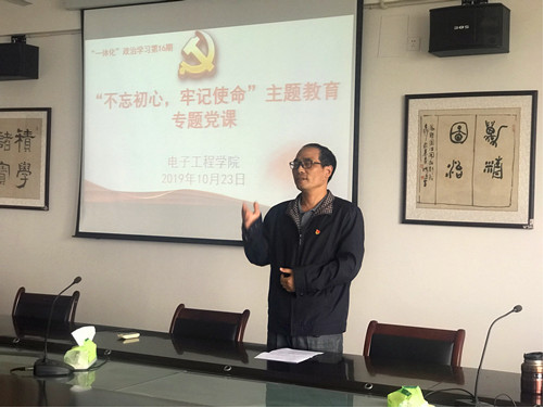 为深入开展“不忘初心、牢记使命”主题教育活动,10月23日下午,电子工程学院开展“不忘初心、牢记使命”主题教育专题党课活动。活动由党委书记孙小明主持,全体教职工和学生党员参加了会议。