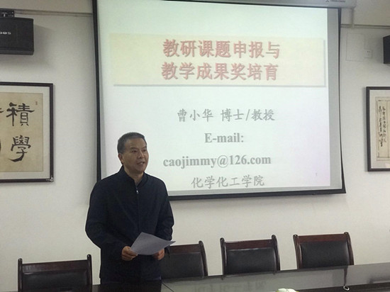 3月31日下午,点点官网特邀化学化工学院副院长曹小华博士在竞知楼904会议室作《教研课题申报与教学成果奖培育》主题讲座。讲座由院长邓长寿主持,全体教职工聆听了讲座。