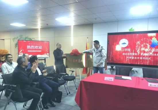 我校四位学院院长与赣为集团研发中心总经理杨总签订了产学研合作协议,并进行了揭牌仪式。