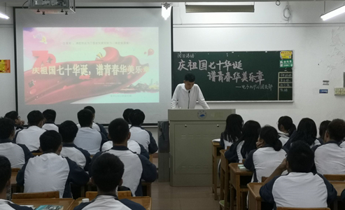 庆祖国七十年华诞,展祖国一百年振兴!在各班团支书的主持下,团日活动分回顾历史、欢庆华诞、开创未来三部分。首先在团支书带领同学们回顾了祖国七十年的艰辛历程,见证了先辈为祖国建设贡献的一幕幕,震撼人心,发人深思。随后进入“我对祖国表白”环节,看着如今强盛的祖国,同学们积极表达对祖国的热爱和赞美,爱国氛围在活动的进行中被推向高潮,现场气氛热情洋溢,处处散发着青春活力,处处展现着同学们的爱国激情。最后以合唱《我和我的祖国》等爱国歌曲的形式结束此次团日活动。