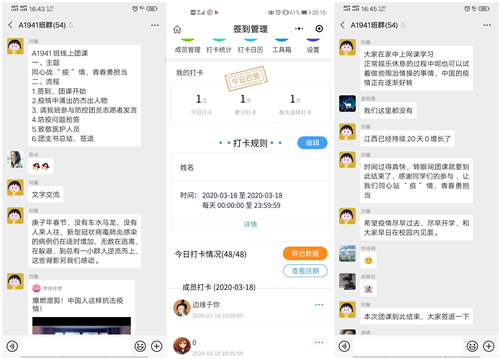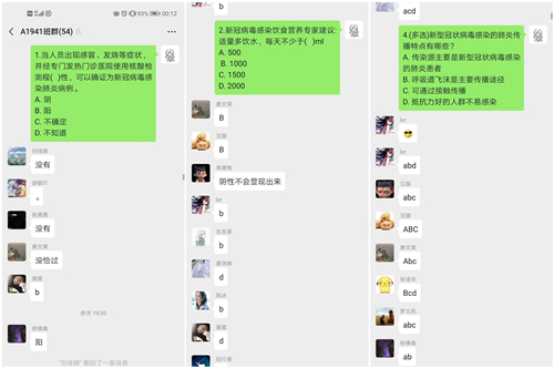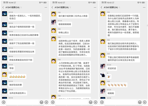 活动开始前,团支书组织班上同学签到,以确保全体同学都能参与本次活动。此次团课活动通过文字、语音、图片与视屏直播等交流形式。团支书首先向同学们概括了此次疫情的发展及影响,同时用实时数据变化加深了同学们对此次疫情严重性的认知;随后,从多个方面讲述了党和政府关于疫情防控的一系列重大决策部署,并向同学们介绍疫情中的杰出人物——钟南山院士、李兰娟院士、张定宇院长、李文亮医生等。在敬佩他们崇高的医德和对疫情防控做出的杰出贡献之余,同学们纷纷表示,作为新时代青年大学生,要以他们为榜样,努力学好专业知识,练就过硬本领,毕业后为人民群众服务,为实现中华民族伟大复兴的宏伟事业奉献出自己全部的力量。接着,参与了返乡大学生团员防疫志愿活动的同学纷纷发表了在防疫期间的经历与感想,也号召同学们要勇于承担“新时代青年的责任与使命”。为增强点点官网团员青年对此次线上团课的参与度,个别班级进行了有关防疫问题的有奖问答活动,同学们踊跃参加,使大家的防疫知识得到提升。最后,全体团员青年对在一线奋战的医护工作者表示诚挚的感谢并致以崇高的敬意。