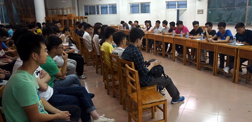 本次座谈会改变大骨班传统的授课方式,分为现任主要学生干部谈工作经验和分组讨论两个部分。首先,团委、学生会主席团成员及各部门部长结合分管的工作与大骨班学员分享了他们的工作经验、感想并对大骨班学员们提出期望。随后,现任学生干部平均分到3个大骨班中去,与学员一起围绕“学生干部工作能力的提高”、“担任学生干部的前途”进行了深入的交流和讨论。