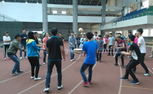 在接下来的“颠鼓击球”项目中,为让学员们能更好的发挥,赛前由3班班主任胡玉勤给学员做了项目介绍并指导他们练习,如何让球稳稳落在鼓上,如何多颠球。在随后的三分钟计时赛里,学员们都绷紧绳子,让球稳稳掉在鼓上,又齐心协力颠球,最终3班颠了130个获得该项目第一名,1班颠了124个获得第二名,2班颠了110个获得第三名。