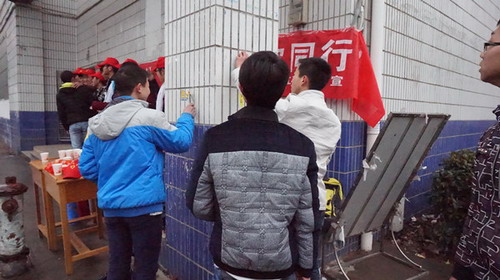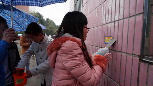 学生一食堂外墙上有许多随意贴的小广告这些牛皮癣影响到了学校的美观和形象。3月5日中午,志愿者们的身影便出现在那里,他们不怕脏、不怕累,不怕冷,冒着蒙蒙细雨,顶着寒风,拿着铲子和水桶,一点一点的对墙面进行清理。铲除墙上的小广告。天气虽然寒冷,却阻挡不了志愿者们积极的热情。志愿者们的汗水,在细雨蒙蒙的校园中汇聚成了一道亮丽的风景线。在这寒冷的初春,志愿者们用自己双手温暖了这个学校,经过大家的共同努力,广告渐渐少了,墙也恢复了原来的本色。