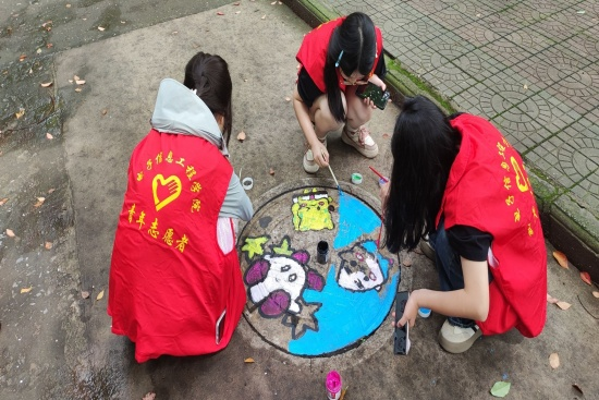 活动伊始,志愿者们到达指定位置,分成若干小组,确定好各组负责区域,领取绘画物资后开始到各组负责区域开始井盖美化工作。志愿者们充分发挥自身的绘画才艺和创作能力,设计出风格多样、色彩丰富的图案,通过创意画笔,将原本普通的井盖涂饰成一幅幅色彩斑斓、妙趣横生的图画,为美丽校园增添了青春色彩,也使单调的井盖摇身一变,成为校园里一道亮丽的风景。