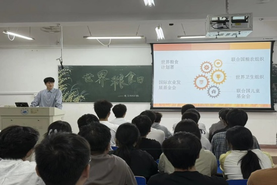 班会现场氛围浓厚,各班级结合学生认知特点设计丰富内容。各班团支部书记通过图文并茂的PPT,展示了全球粮食短缺的严峻现状与我国粮食生产的发展历程。从“一粒米需经历120天生长”的科学数据,到“农民伯伯弯腰收割”的辛劳场景,同学们在细节中深刻体悟“粒粒皆辛苦”的内涵。部分班级还组织观看了科普短片《一粒米的一生》,影片生动呈现了粮食从播种、耕耘、收获到加工、运输直至端上餐桌的全过程,让同学们对粮食的来之不易有了更直观、更深刻的认识。