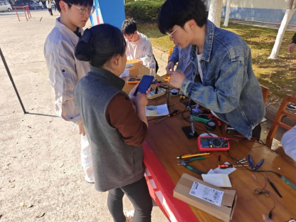 活动现场,志愿者们各司其职、热情细致。登记处的同学耐心接收师生送修的物品,逐一详实记录故障描述;维修区的同学们则利用万用表、电烙铁等专业工具,认真检测、拆解、排查,展现扎实的专业技能。本次活动共接收包括鼠标、手电筒、小台灯等多类常用电子设备。经现场检修,多数手电筒、小台灯等故障被成功修复,切实解决了同学们的日常使用难题。针对部分暂无法修复的设备,志愿者也耐心解释原因,并提供后续处理建议。