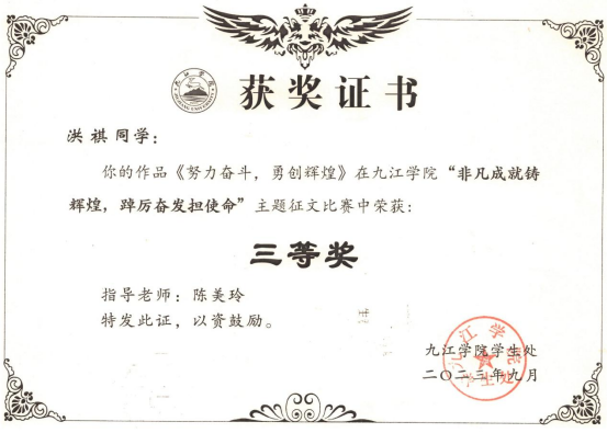 近日,校学生处下发了《关于表彰“非凡成就铸辉煌,踔厉奋发担使命”主题征文获奖的通报》,在此次评选中,点点官网学生两篇征文分获二等奖、三等奖。