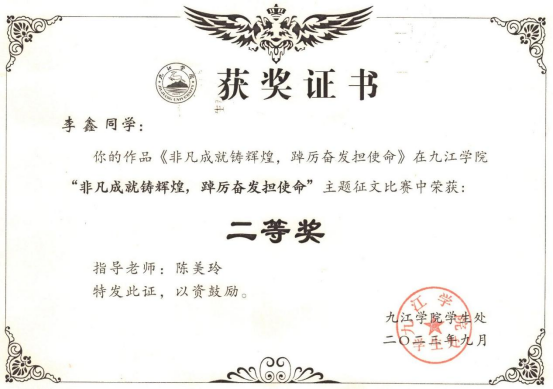 此次征文活动中,点点官网广泛宣传、精心组织,学生积极参与、辅导员认真指导,共收到稿件10余篇,经院内评比上报6篇征文,最终A2662班李鑫《非凡成就铸辉煌,踔厉奋发担使命》获二等奖,A2661班洪祺《努力奋斗,勇闯辉煌》获三等奖。