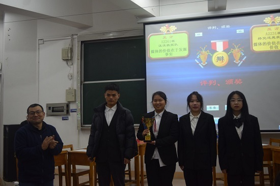 参加“新生杯”辩论赛的七支队伍采取淘汰制,经过前期的激烈角逐,A2261班代表队与A2231班代表队脱颖而出,闯入本次决赛。本场比赛由A2261班代表队担任正方,论证媒体的价值在于发掘事实,A2231班代表队担任反方,论证媒体的价值在于倡导价值。赛场气氛至始至终都异常活跃,每个比赛阶段参赛选手大胆辩论,语言流畅且极具个性化,引经据典,妙语横飞,让观众感受到了一场别具特色的辩论盛宴,并给予热烈的掌声。在一番激烈的答辩后,A2231班代表队凭借四位选手敏捷的思维和雄辩的口才获得此次辩论赛冠军。在活动的最后,由盛健老师对选手进行点评,并为最佳辩手以及胜出队伍颁奖。