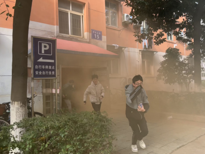 疏散演练模拟15栋3楼宿舍发现火情,火灾警报突然响起,值班人员迅速就位,启动消防安全预案,组织疏散,同学们由寝室长带领按照“低姿、弯腰、捂口鼻”口诀,根据引导有序撤离,整个演练过程组织有序,疏散迅速。
