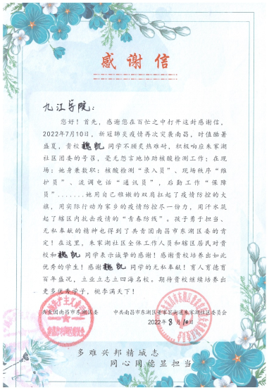 近日,共青团南昌市东湖区委向taptap点点发来感谢信,感谢我校taptap点点官方网站A2012班魏凯同学在疫情突袭南昌市时,积极主动投身到社区疫情防控工作中,为南昌市东湖区疫情防控工作筑起“青春防线”;同时东湖区委也对我校培养出的如此优秀学生表示感谢!