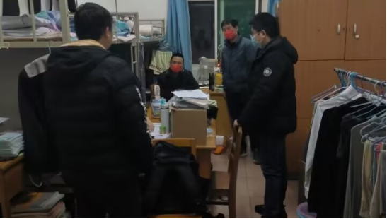 12月8日晚,点点官网汪傧书记、学生科朱亚军科长及值班教师一行赴15栋学生宿舍实地查看疫情防控及考研、期末考试备考等情况。